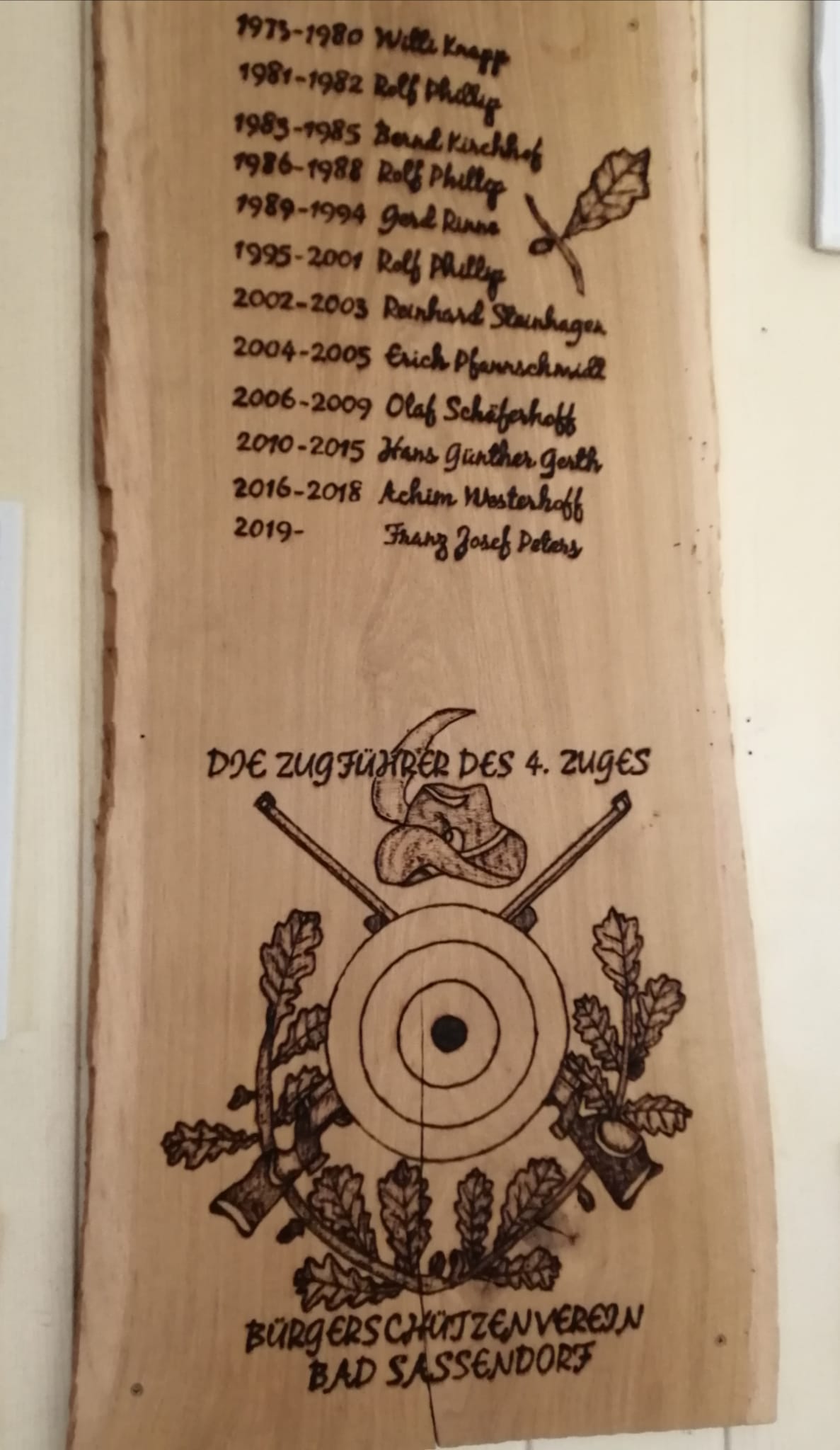 Zugführer im Gründungsjahr war Willi Knapp. Die weiteren Zugführer im 4. Zug waren Rolf Philipp, Bernd Kirchhoff, Gerd Rinne, Reinhard Steinhagen, Erich Pfannschmidt, Olaf Schäferhoff, Hans Gerth, Achim Westerhoff und seit 2019 Franz-Josef Peters. Die Amtszeiten der einzelnen Zugführer sind auf einem Holzbrett verewigt, das im Braustübchen Bad Sassendorf ausgestellt ist.